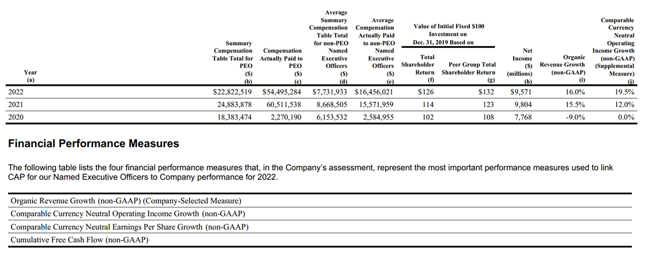 A few notable aspects of Roper’s disclosure jump out. First is their use of two CSMs. They use measures of free cash flow and EBITDA as equally-weighted metrics in their LTIP, so they elected to use both as CSMs in the PvP table. This is allowed under the PvP rule, though we saw other firms elect to simply choose one metric as their CSM and include the other(s) in their tabular list.
