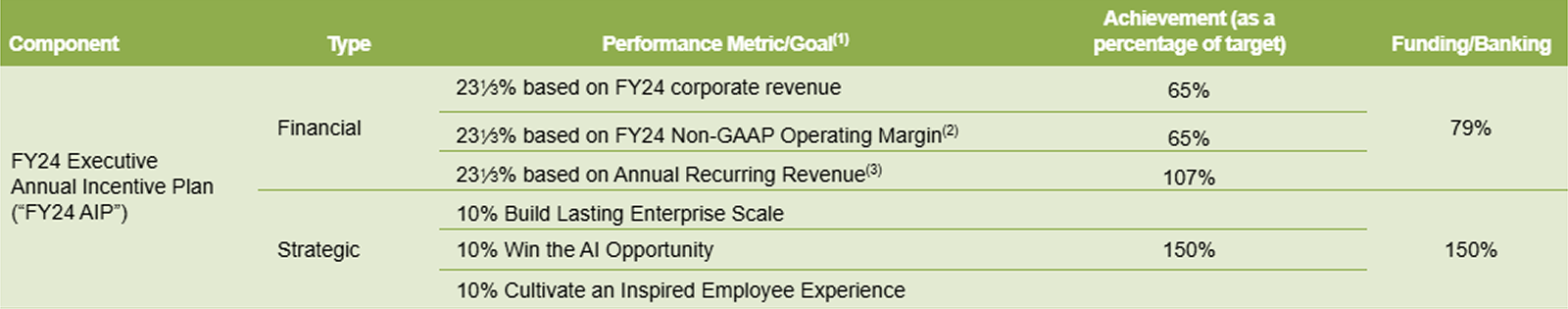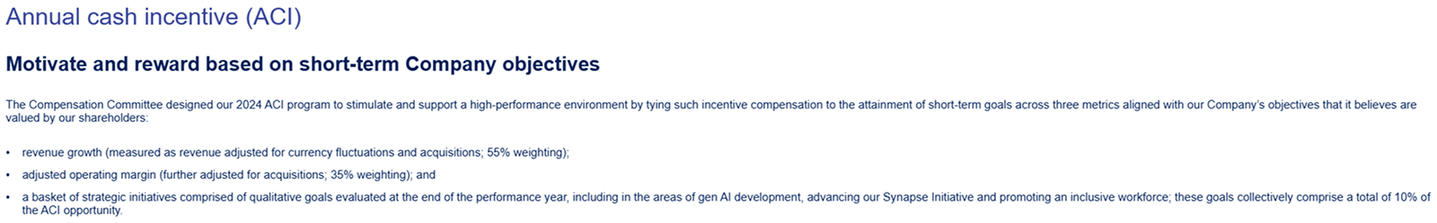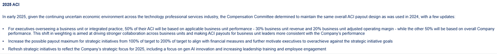 Another example of AI-focused performance goals in annual incentive plans comes from Cognizant Technology Solutions. The Company disclosed a goal tied to generative AI development and advancement in its fiscal year 2024 program and indicated it will include a similar objective in its 2025 annual cash incentive plan.