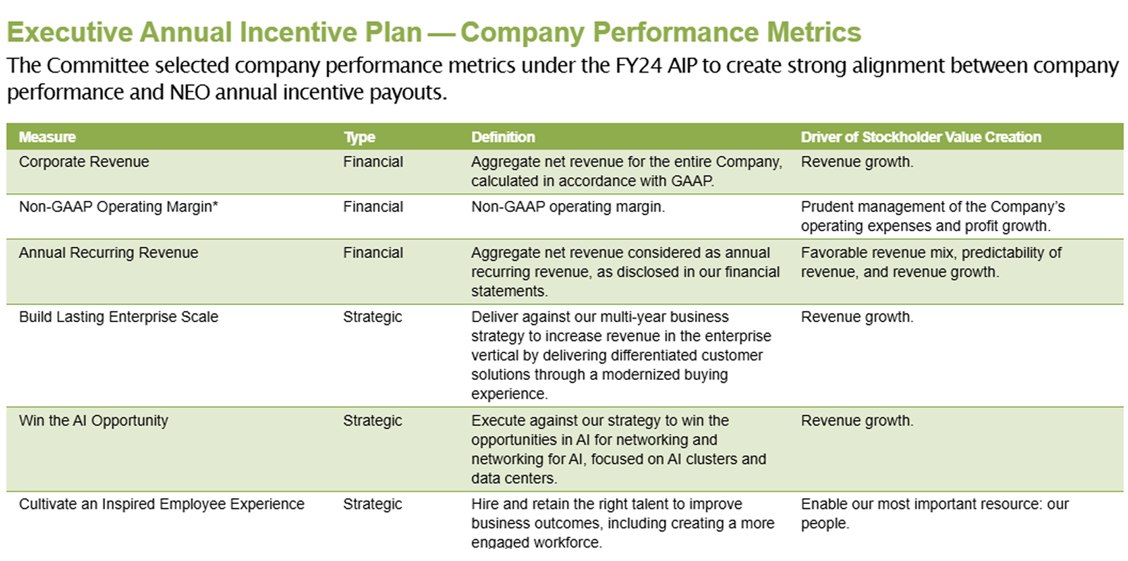 As part of its executive annual incentive plan, Juniper Networks disclosed a strategic, standalone goal to win the AI opportunity, weighted at 10%. The Company defined this goal as executing against its strategy to capture opportunities in AI for networking and networking for AI, with a focus on AI clusters and data centers. Juniper links this objective to revenue growth.