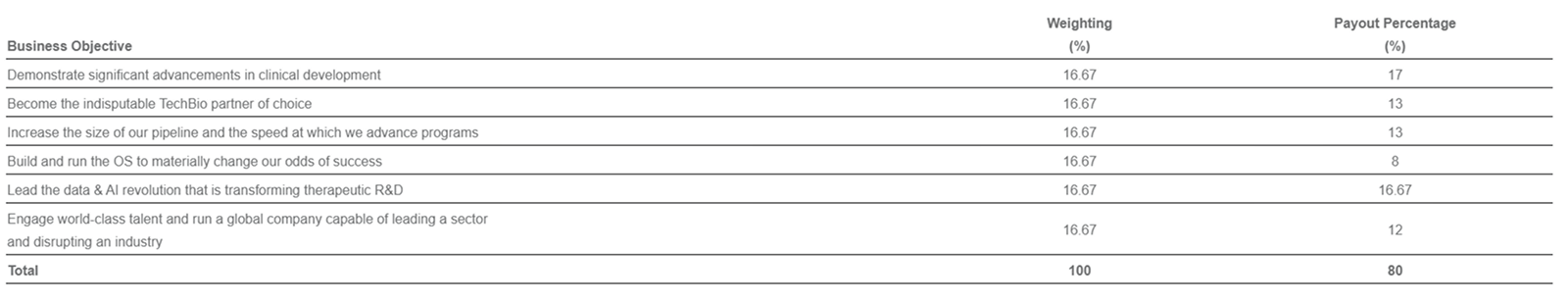Recursion Pharmaceuticals, which prides itself on using AI and data to enhance modern medicine, also featured an AI goal in its annual incentive program. The Company disclosed a goal to “lead the data and AI revolution that is transforming therapeutic R&D,” which was weighted at roughly 16.7%.
