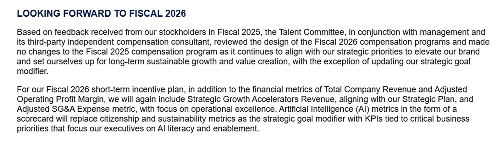 While Ralph Lauren did not feature any AI metrics in its most recent executive incentive plan, the Company did announce that it plans to do so for fiscal year 2026. The Company disclosed that it plans to implement AI scorecard metrics that will replace citizenship and sustainability measures as the strategic goal modifier, using KPIs tied to key business priorities to drive executive AI literacy and enablement.