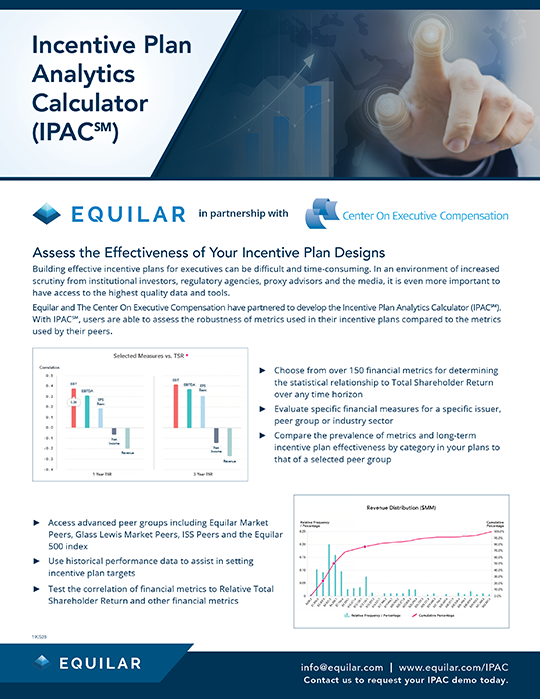 Equilar and The Center on Executive Compensation have partnered to develop the Incentive Plan Analytics Calculator (IPACSM). With IPACSM, users are able to assess the robustness of metrics used in their incentive plans compared to the metrics used by their peers.