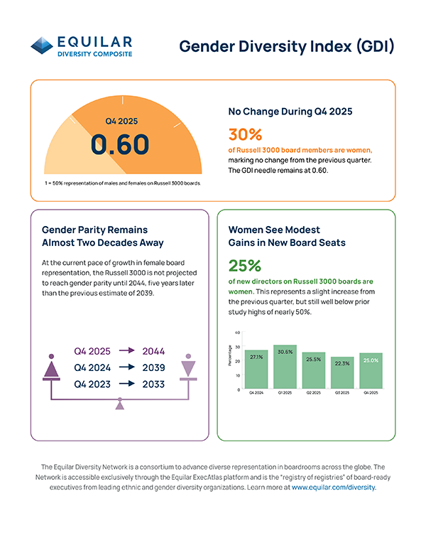The pace of progress toward gender diversity on corporate boards has stalled. According to the Q4 2025 Equilar Gender Diversity Index (GDI), women hold 30% of Russell 3000 board seats. This marks no change from the previous quarter, as the GDI needle remains at 0.60, where 1.0 represents gender parity between men and women.