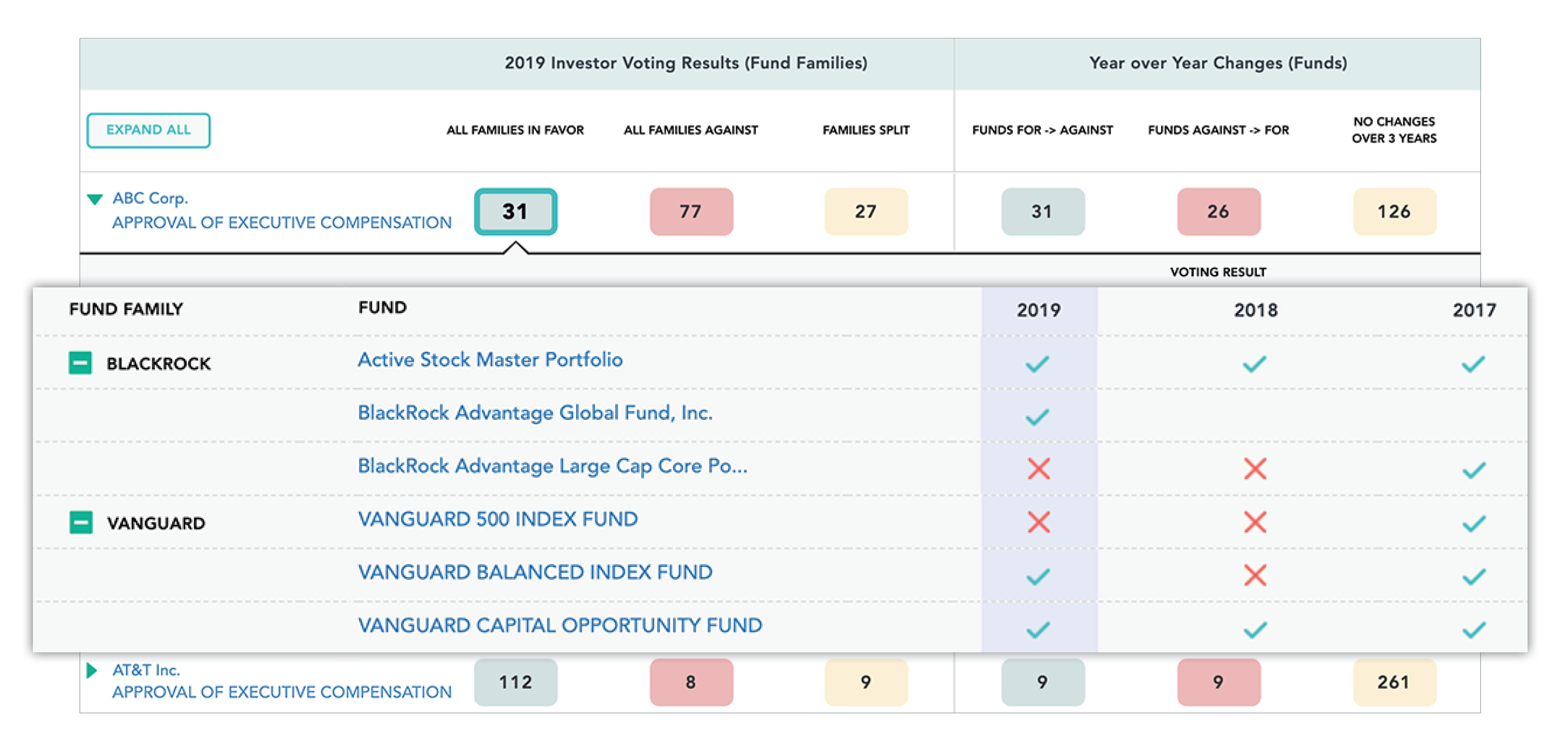 Investor Voting Results, available within Equilar Insight, now includes 2019 institutional investor votes, allowing clients to see detailed, fund-level voting on the most prevalent management and shareholder proposals, including Say on Pay.